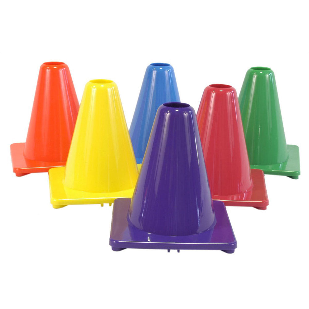 Cônes résistants en plastique pour toutes les activitées d'éducation physique autant à l'intérieur qu'à l'extérieur. Prévient les blessures si jamais il y avait une chute grâce au plastique flexible.