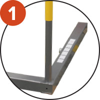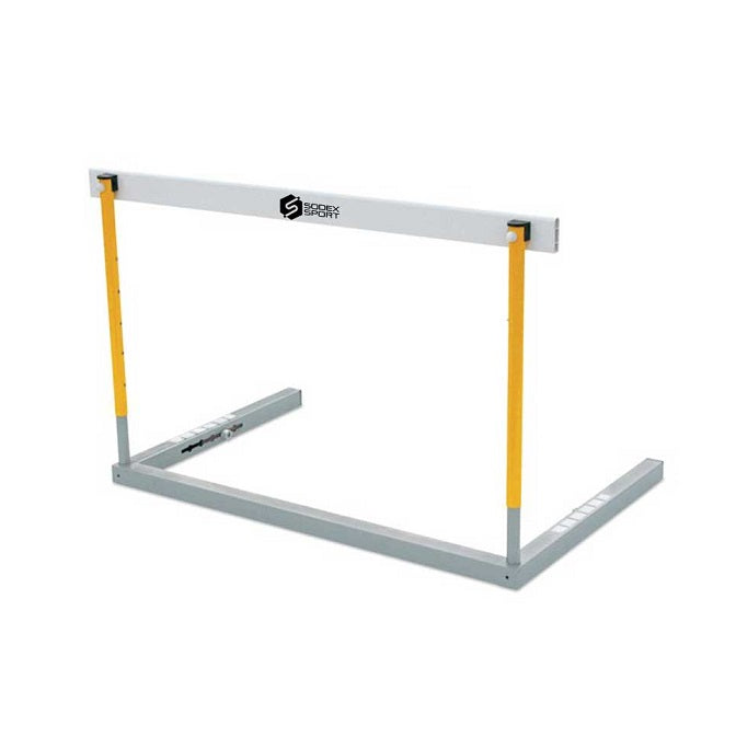 Haie de compétition base en acier ajustable de 0.76m à 1.06m. Contrepoids de retour et barre du dessus en bois. Longueur 1.2m x 0.72m de profond. Les contrepoids peuvent être ajustés sur 5 positions, permettant un équilibre optimal pour la force de basculement, conformément aux recommandations des Fédérations d'athlétisme.