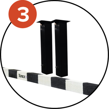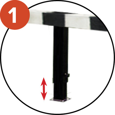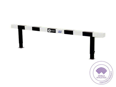 Haie de steeple fixe pour saut d'eau. Un saut d'obstacles aquatique certifié IAAF, réglable en hauteur de 0,762 m à 0,914 m, conçu pour être fixé au sol par des plaques. CERTIFIÉ World Athletics. Fixation par plaques. Poutre en bois qui gardera sa forme d'une section de 12,7 x 12,7 cm. Châssis en acier galvanisé démontable pour stockage. Réglage des hauteurs par tube galvanisé verrouillé automatiquement par ressorts.