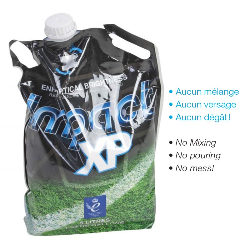 Peinture liquide hautement concentrée prête à l'emploi. Aucun ajout d'eau, aucun mélange ni aucun versage nécessaire. Possibilité de traçage d'un terrain de soccer standard avec un minimum de 1 litre de peinture. Fonctionne à la fois sur gazon et surfaces dures