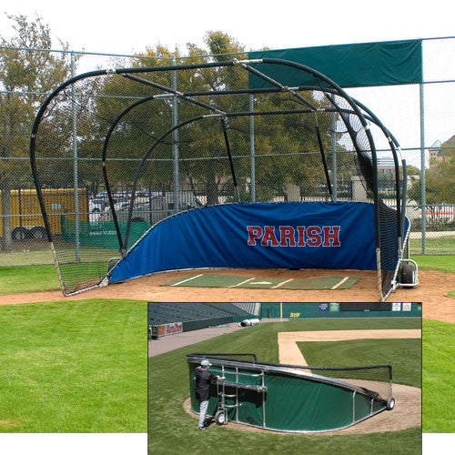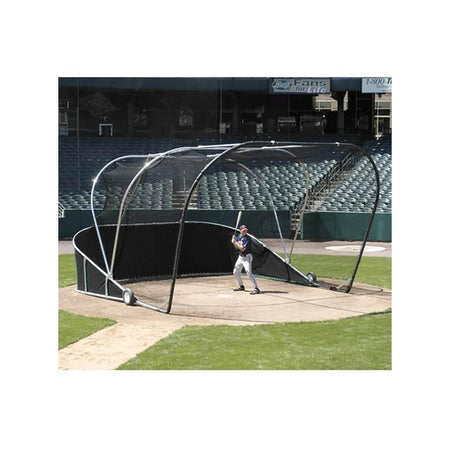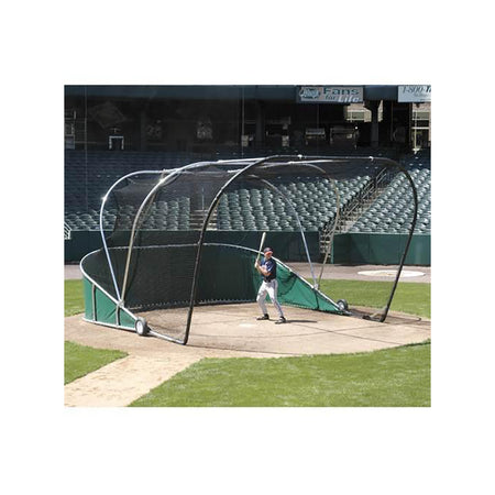 Cage de frappeur portable fait en aluminium filet de 3.5mm de nylon résistant aux conditions météo couvert de toile de nylon 18oz. Pneu de 16'' facile à déplacer. 18' largeur x 22' de profond et 12' de hauteur. Garantie 5ans du manufacturier