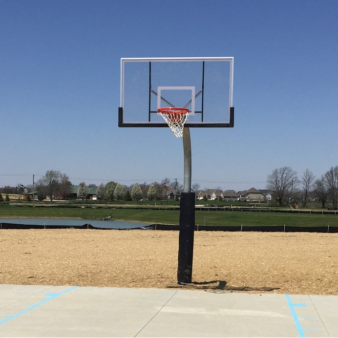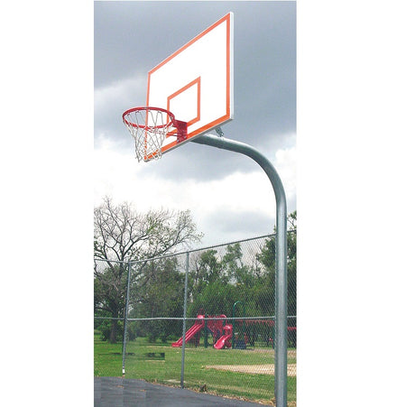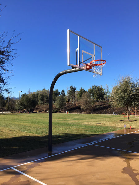 Fait d'acier galvanisé de 5 9/16" extrêmement solide. La courbe du poteaux procure 6' de jeu libre. Choix de panneau. Anneau double en acier fixe pour les panneaux en acier et breakaway pour les paniers en acrylique. Ensemble complet fait pour durer et pour une utilisation robuste. Livraison par camion, prix à confirmer.