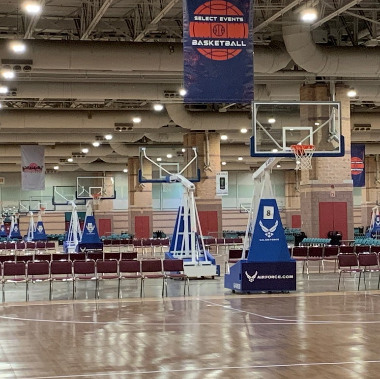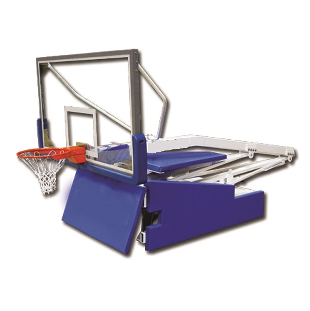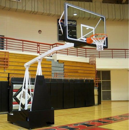 Le Hoopmaster arbore une flèche de régulation de 5' or de 8' se fixant directement au bord de rupture pour une stabilité maximale du panneau arrière en verre et un système de levage des roues de protection du sol. La base est entièrement recouverte d'un rembourrage en vinyle pour la sécurité des joueurs et peut être décorée pour promouvoir le marketing de l'équipe et des sponsors. (extra exigé)
