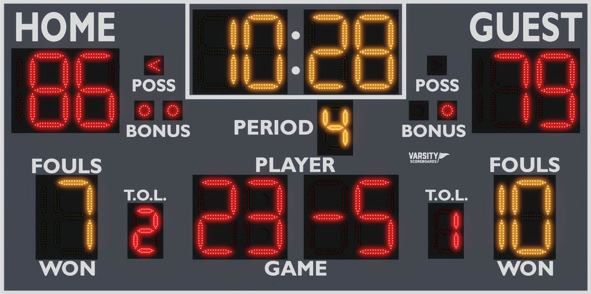 Grand tableau indicateur de basketball. Notre tableau d’affichage de basket-ball le plus large et le plus complet est parfait pour les grands espaces. Chiffres LED de 15 pouces avec écrans de protection. Note Accueil/Invité jusqu'à 199. Indicateurs de double bonus et de possession. Armoire en acier galvanisé avec finition en poudre.