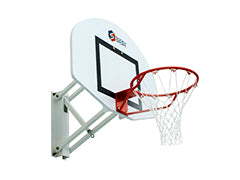 Montant de Basketball Mural Complet. But fixe mural avec hauteur d'anneau réglable de 2,60m à 3,05m, saillie 0,60m. Acier galvanisé résistant. Panneau de fibre peint d'aspect éventail. Les deux poutres de support sont en acier peint par poudrage blanc.