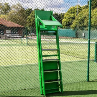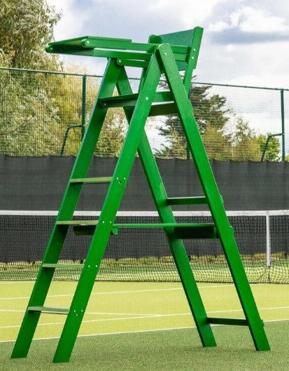 Chaise d'arbitre de tennis en bois de Vermont. Chaise d'arbitre de tennis professionnelle fabriquée à la main à partir de bois de première qualité et peinte en vert. La conception simple à plier permet un rangement facile. Complet avec un plateau pivotant, des marches antidérapantes et des fixations en acier robustes.