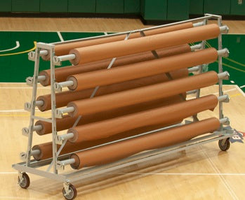 Cart de couvre plancher. Système de support de stockage mobile. Un support à rouleaux de style roulement à billes exclusif qui intègre une conception à roulement à billes en acier à 4 roues. Augmente la capacité de charge sur chaque support. Permet un fonctionnement plus fluide de l'installation et de la récupération de chaque section de revêtement de sol du gymnase. Augmente la robustesse du rack. Roues en poly innovantes et non marquantes de 8″ de diamètre. Augmente la capacité de charge totale à 4 000 livres. Permet un mouvement plus facile pour installer et récupérer. Peut contenir jusqu'à 10 rouleaux