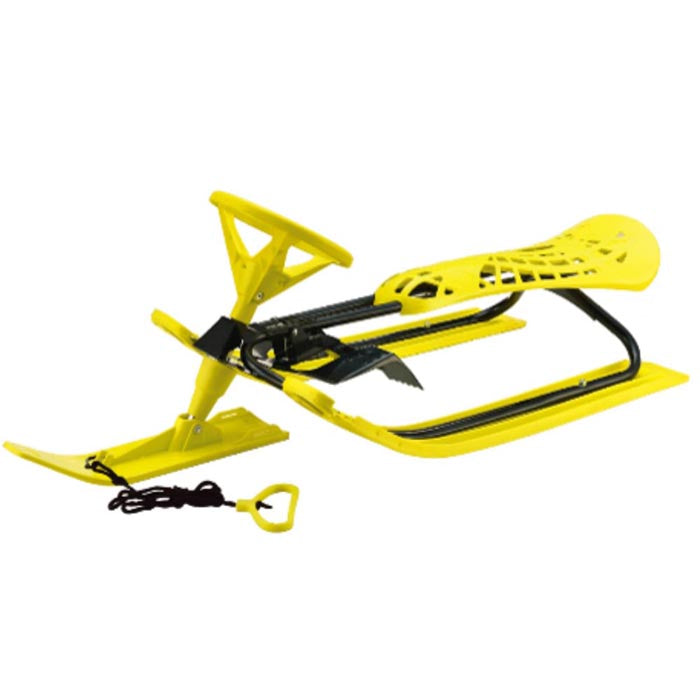 Ce traîneau trois skis jaune pour enfants avec un volant. Offert en couleur Noir/Jaune. Fait de plastique et structure en aluminium.