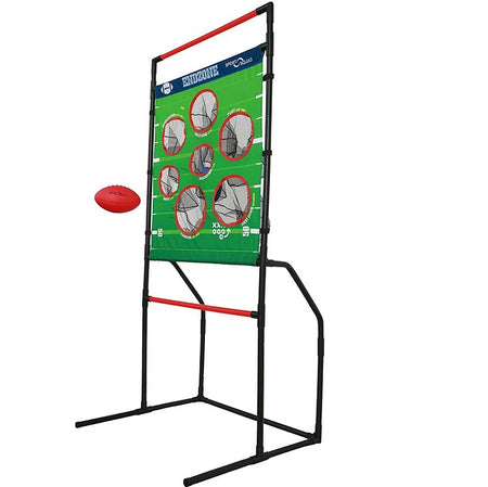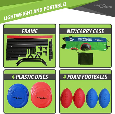 Les ensembles de Jeux de Football Endzone de Sport squad contiennent la structure, quatre disques de plastiques, quatre ballons de football en mousse et un sac de rangement.