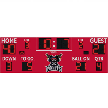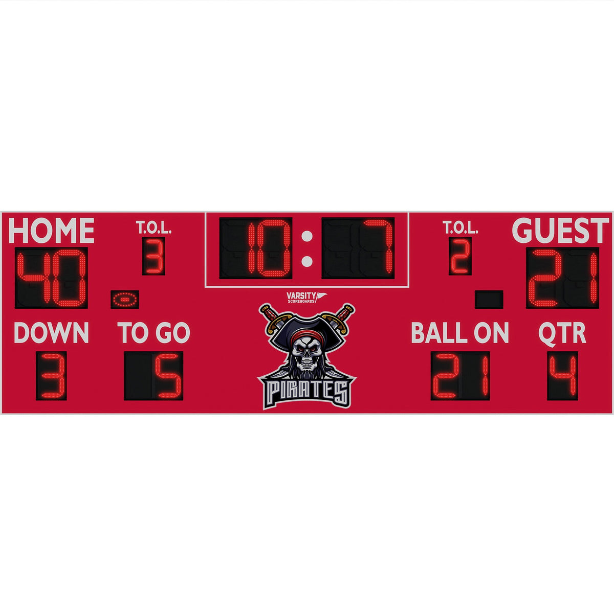 Tableau de pointage de football extérieur avec choix de couleurs. Dimension de 24' x 8' x 8" épaisseur. Les chiffres de 26" x 20" et 15" LED. Horloge jusqu'à 99:59. Affiche en digital 2 chiffres, le pointage de chaque équipe, le quart, l'essaie, la distance à franchir et la situation du ballon. Contiens une sirène de fin de match. Indicateur de possession.