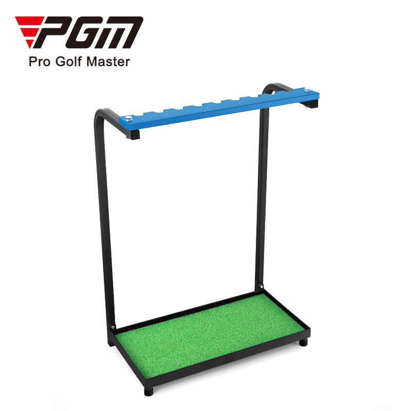 Support de bâtons de golf pouvant contenir 9 bâtons. Fait en métal rigide et durable pour l'extérieur. Facile a installer et solide. N'égratigne pas les bâtons grâce au tapis de gazon synthétique a la base du support.