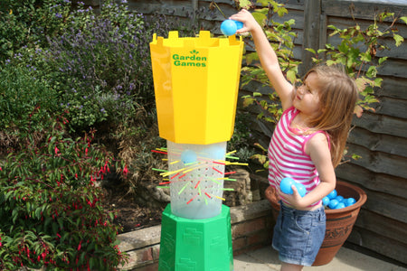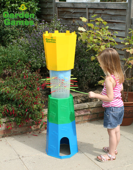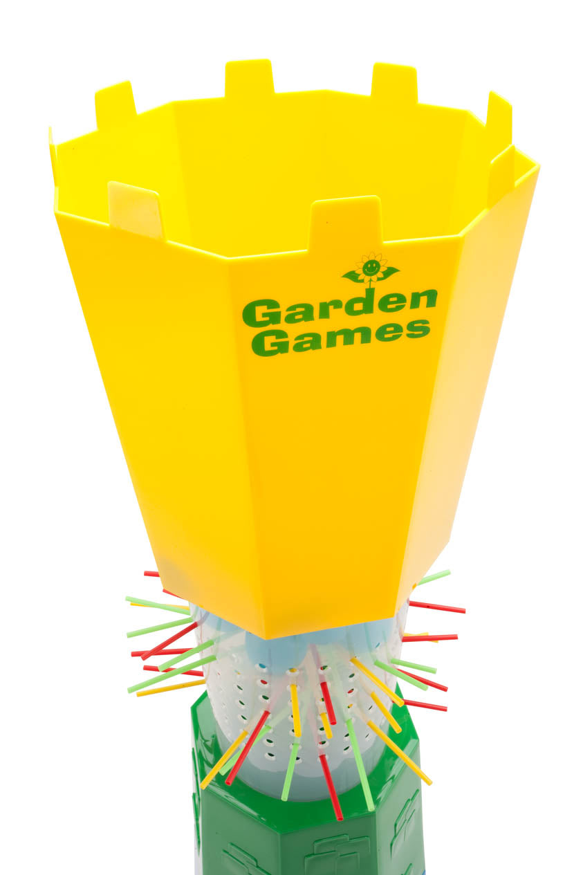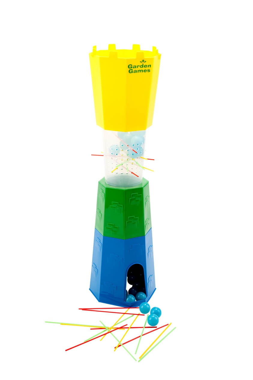pailles colorées géantes. Le jeu consiste à enlever les pailles à tour de rôle un par un, sans faire tomber les boules à l'intérieur de la tour du château.