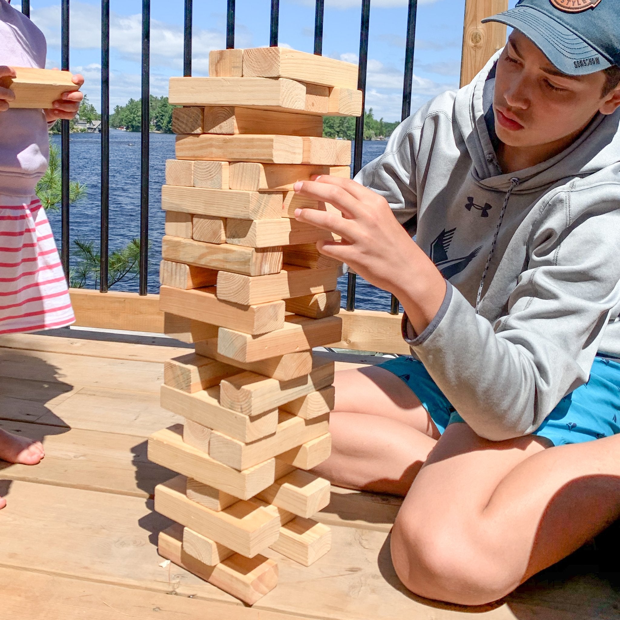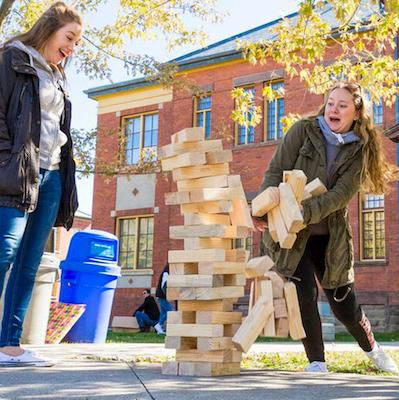 Ce jeu de tour en bois géante est l'idéal pour du plaisir en famille n'importe où. Apportez-le facilement en utilisant le sac de transport inclus. Il y a un total de 58 blocs dans le sac. Amplement pour vous amuser longtemps!