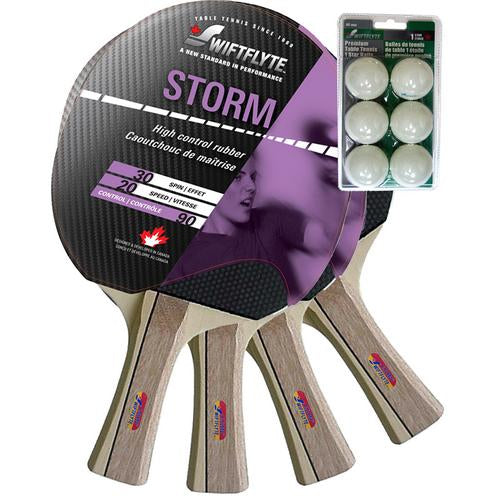 Comprend 4 raquettes Storm et 6 balles 1 étoile. Taille de la table : 274 x 152,5 x 76 cm (9'x5'x2,5'). Dessus en MDF de 16 mm (5/8 po). 2 pièces séparées se plient pour un rangement plus compact que la conception de table traditionnelle. Cadre 13 x 23 mm (1/2" X 1"). Jambes 30 x 30 mm (1 ¼"). Comprend un filet de serrage rapide et un ensemble de poteaux.