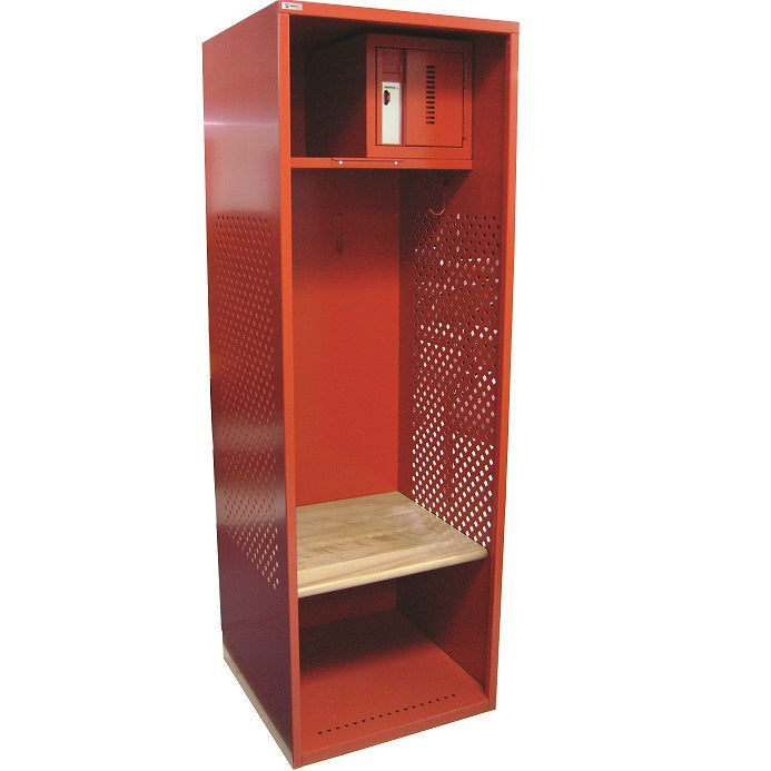 Casier de vestiaire ventilé avec banc intégré. Les panneaux de côtés sont ventilés pour permettre d'assécher les équipements et évacuer les odeurs. Ces casiers viennent avec une tablettes du haut et un mini casier de 12" x 10" avec clefs. Quatre crochets et 1 barre de cintres. Un siège de bois pour le confort et un esthétique de qualité. Produit fabriqué au Québec. Choix de couleur.