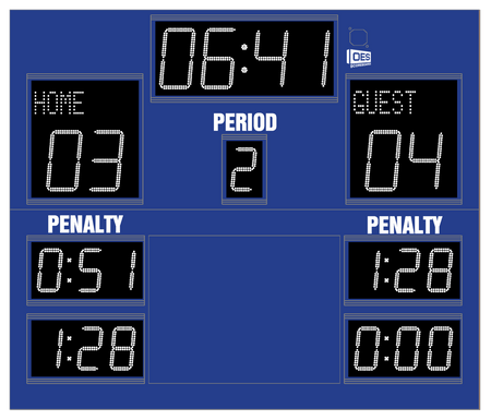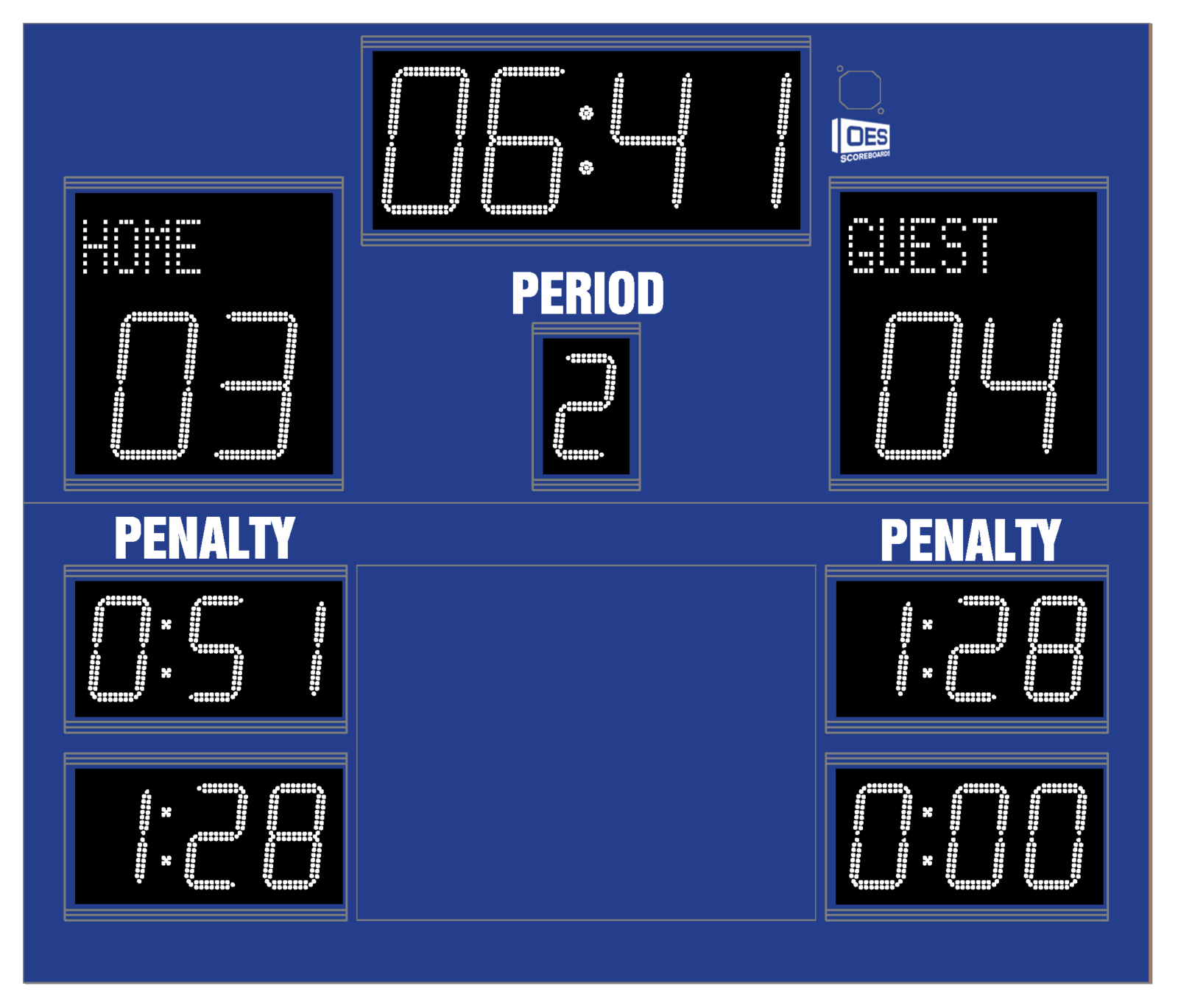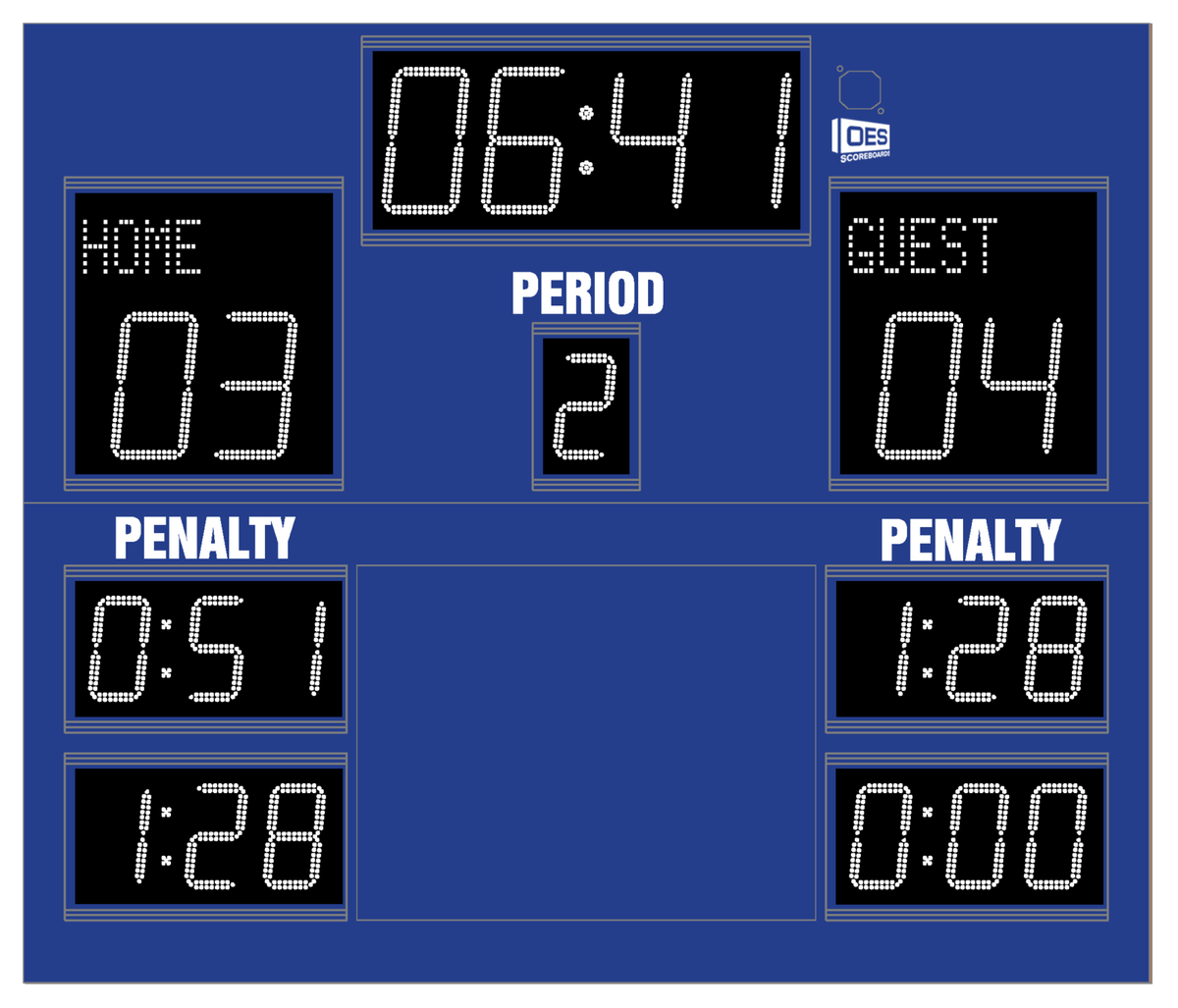 Temps de jeu jusqu'à 99:59 et scores à domicile et invités, période et temps de pénalité. Comprend également un klaxon intégré. L'affichage du temps de jeu s'ajuste automatiquement à 1/10 de seconde lorsque l'horloge est inférieure à 1 minute. Facilement ajusté pour d'autres sports lorsqu'il est associé à un contrôleur OES.