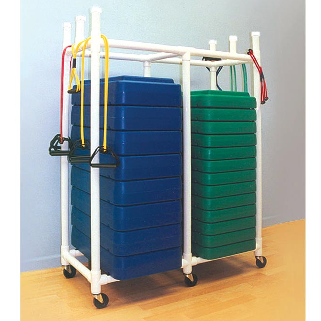 Des "bandes antidérapantes" en vinyle sur l'étagère inférieure maintiennent les marches en toute sécurité sur le chariot pendant le transport. Un instructeur peut facilement transporter suffisamment de marchepieds et d'accessoires pour toute la classe. Mesures : 45"L x 19"L x 64"H.