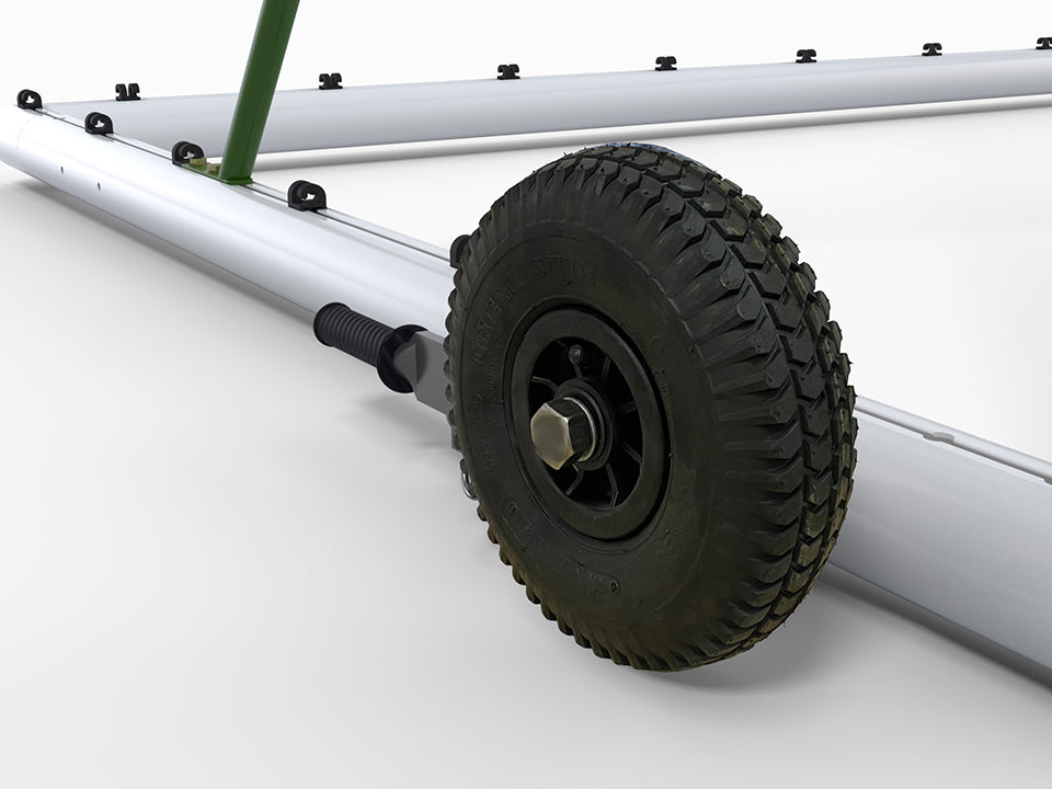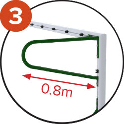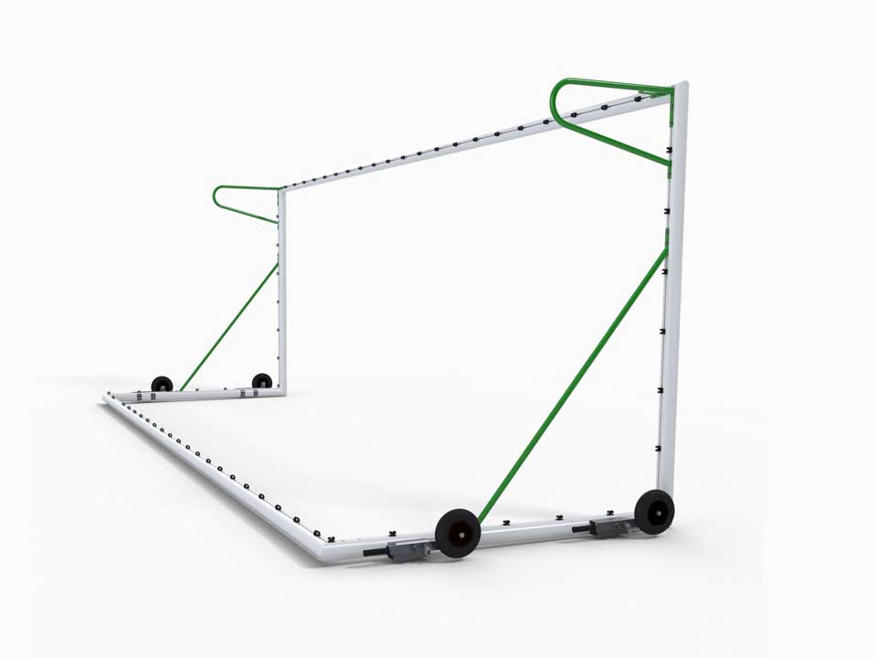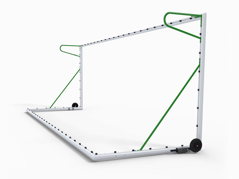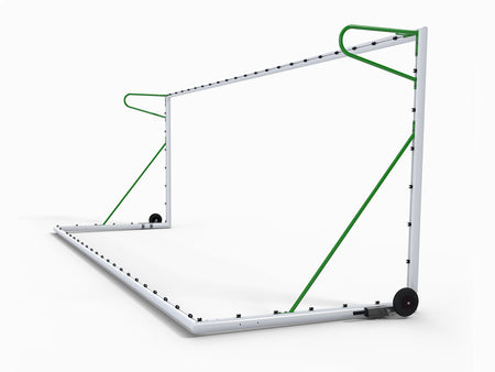 But de football mobile et autoportant en aluminium. Peint par thermolaquage blanc avec support de filet supérieur. Les renforts de but et les supports de filet sont en acier galvanisé Ø34 mm, thermolaqué couleur vert. Fixation de filet par crochets en PVC. Vendu avec crochets de filet et accessoires d'ancrage.
