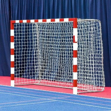 But de Futsal Handball repliable. But de futsal ou handball  de 3 m x 2 m fabriqué en aluminium renforcé peint au jet . But de football et handball de taille réglementaire pour le futsal ou handball avec un filet de but tressé traité contre les UV, des cadres latéraux rabattables et des barres arrière amovibles en acier galvanisé. Design rayé rouge ou bleu.
