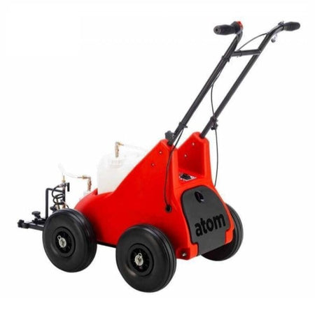 Machine pour peinture à ligne ATOM électrique avec pneus anti-crevaison. Réservoir autonettoyant de 340oz et buse de pulvérisation en laiton anti-gouttes. Pour une utilisation sur les surfaces d'herbe et d'asphalte.