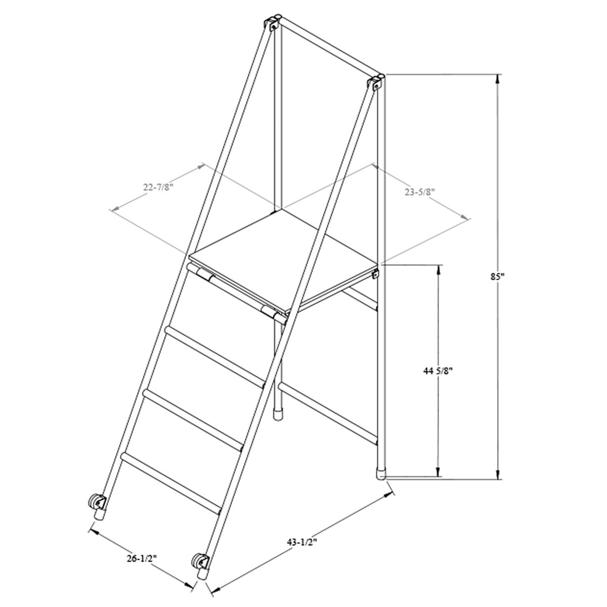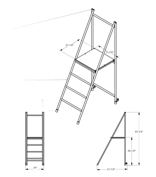 Dimensions : Hauteur totale : 85" (216 cm). Largeur: 26-1/2" (67,3 cm). Largeur de la base ouverte : 43-1/2" (110,5 cm) Dimensions de la Plateforme : 22-7/8" x 23-5/8" (58 cm x 50 cm) Hauteur : 44-5/8" (113,3 cm)