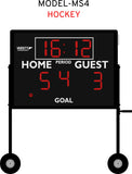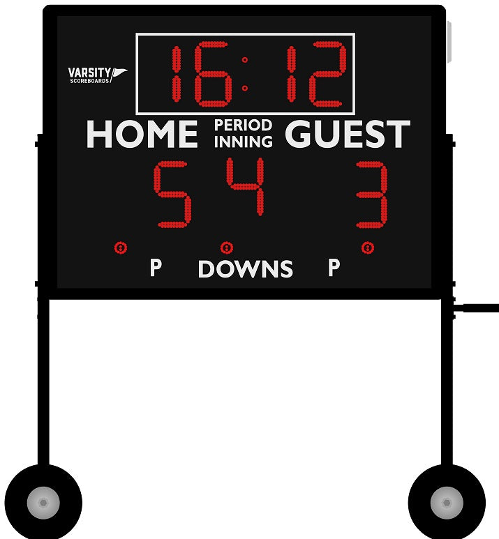 Chiffres LED 9". Armoire en acier galvanisé avec finition en poudre. Ensemble de pattes roulantes. Scores de baseball, softball, football, soccer, hockey sur gazon, crosse, volley-ball, basket-ball, lutte et athlétisme. Klaxon intégré. Télécommande sans fil. Batterie interne rechargeable