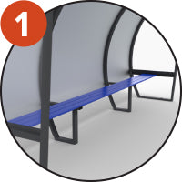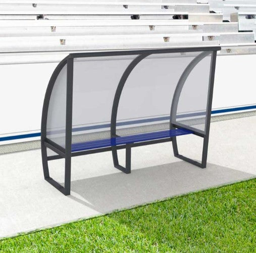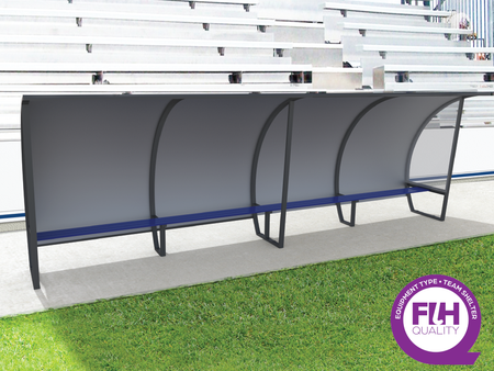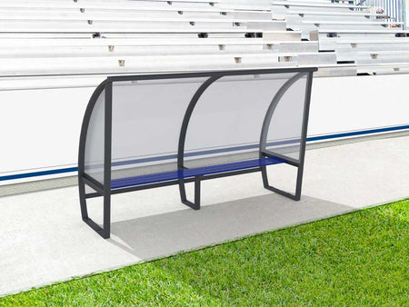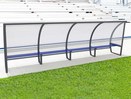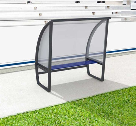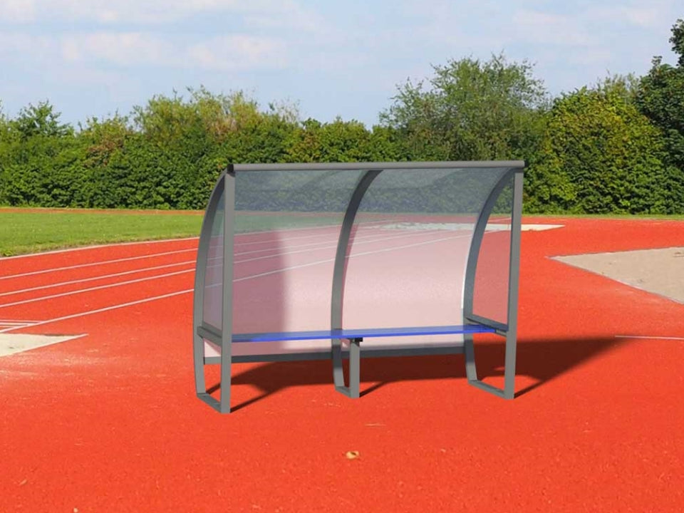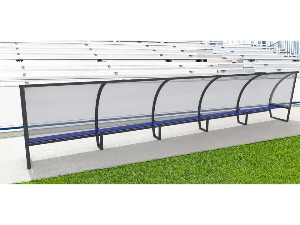 Abri de joueurs pour les lignes de touche en aluminium. Banc en aluminium et arrière transparent en plaque de polycarbonate. Ancrage inclus. Tous les côtés sont résistants aux chocs afin de protéger les personnes des balles ou des projectiles. Barre supérieure avec profil incurvé pour éviter les blessures à la tête et attache cachée.
