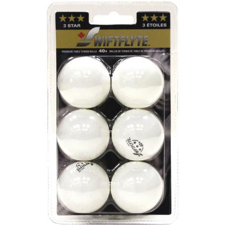 Balles de ping pong 3 étoiles Swiftflyte. Balles de compétition plastiques de qualité. Grandeur de 40mm. Durable, conserve sa forme. Vendu en boite de six. Couleur blanche.