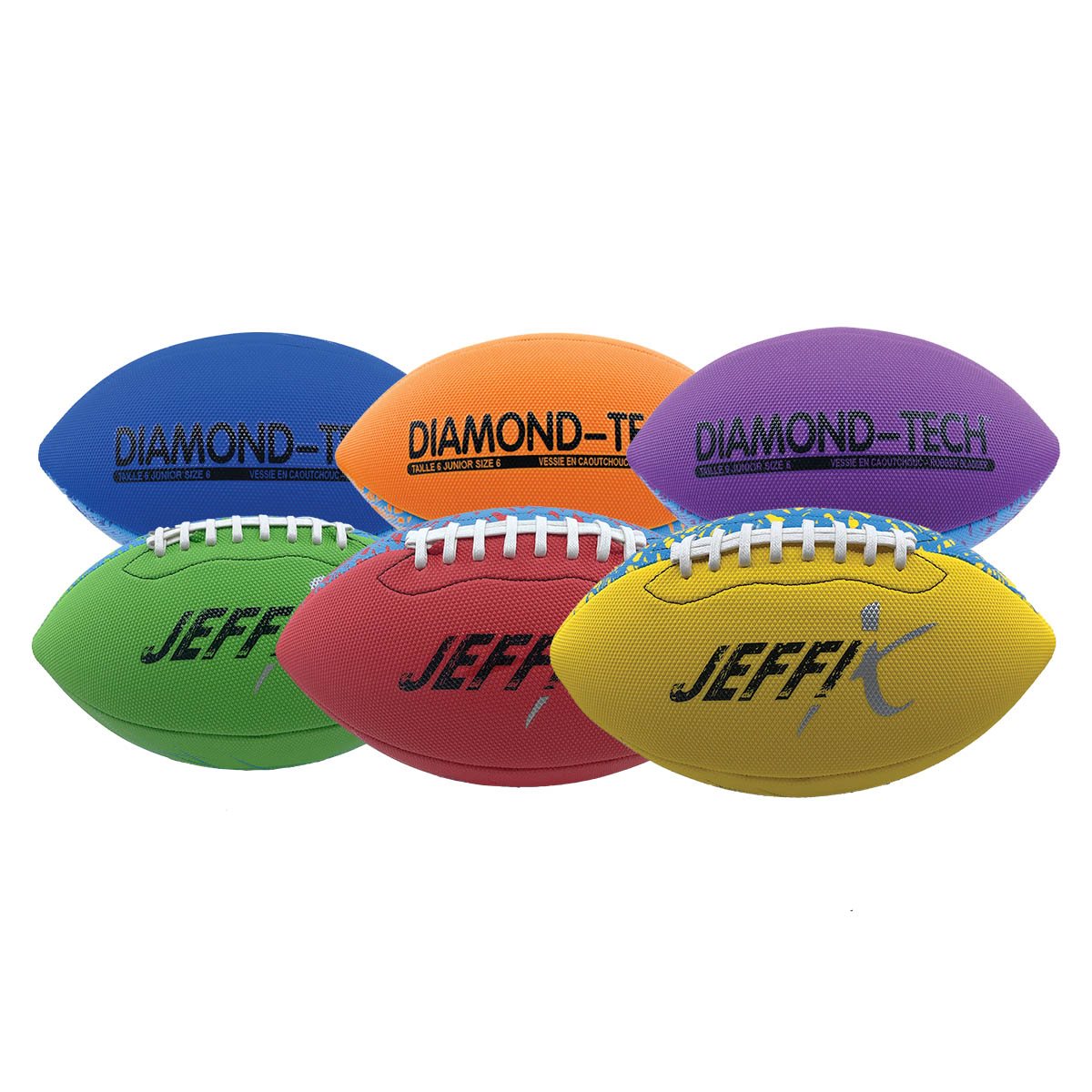 Ballons de football gonflables technologie exclusive DIAMOND-TECH™, fait d'une enveloppe de coton pour une grande souplesse, recouvert de mousse PVC. Idéal pour les jeunes à cause de la touche plus douce. Vendu en groupe de 6.