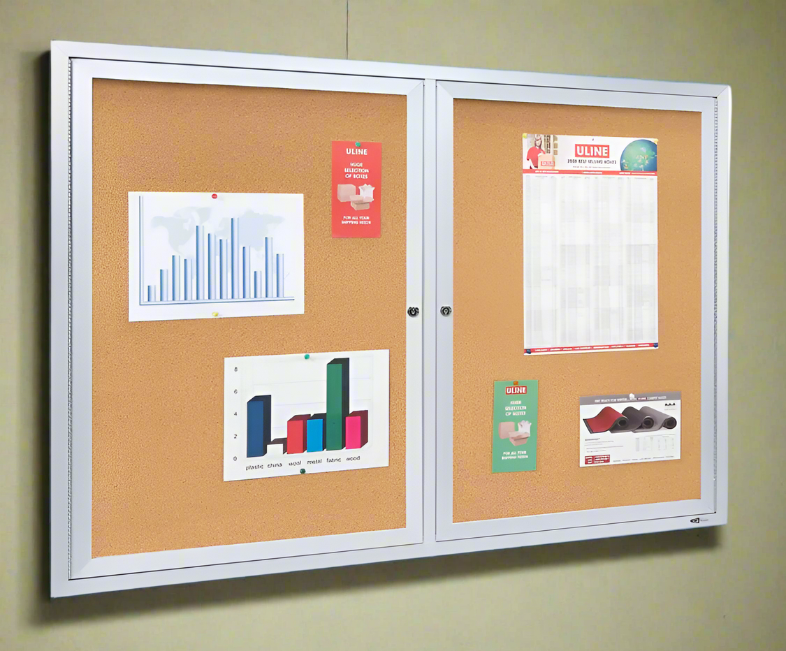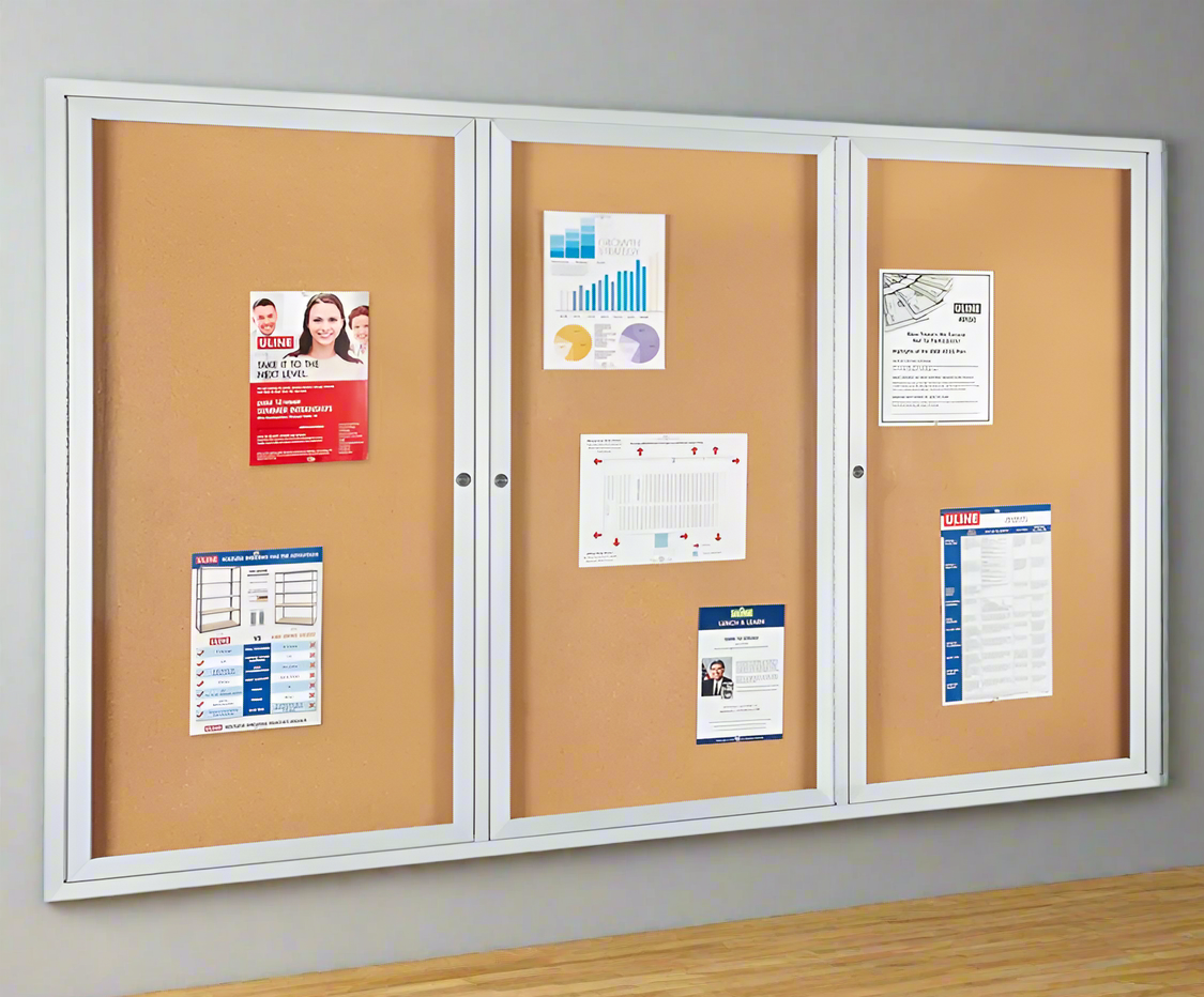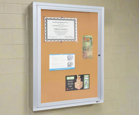 Cabinet mural vitré cadre en aluminium avec porte à clef. Tableau de liège pour agrafer facilement mémo et feuille. Viens en trois grandeur au choix.
