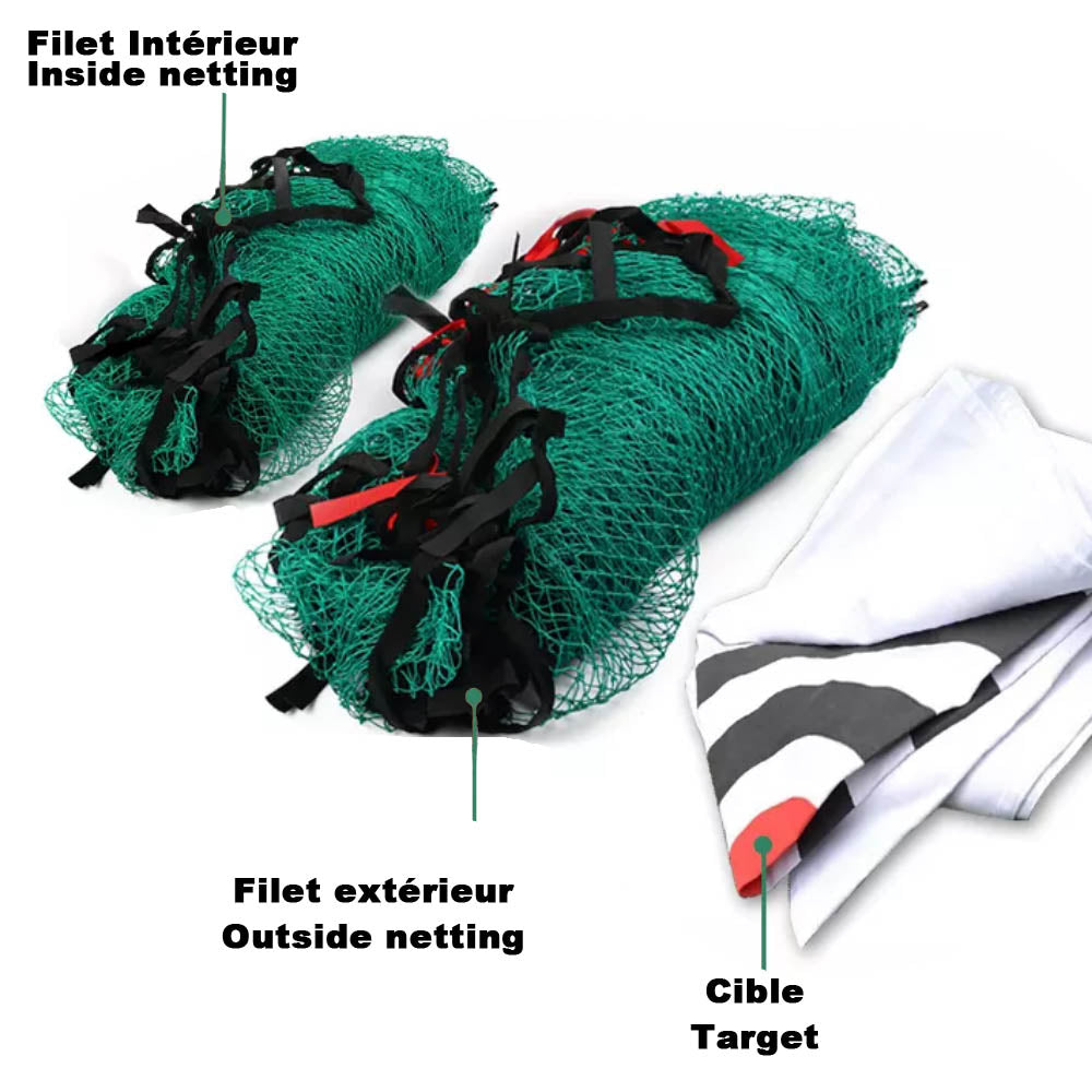Cage de golf pro facile à installer parfait pour pratiquer votre élan dans votre cour ou pour vous réchauffer avant une partie. Structure en acier peinte au jet de sable et filet résistant au rayon du soleil. Filet de 2.3mm avec un fond doubler. 10ft L x 10ft W x 10ft H. Poids de 110lbs, recommander de démonter ou sécuriser en cas de grands vents.
