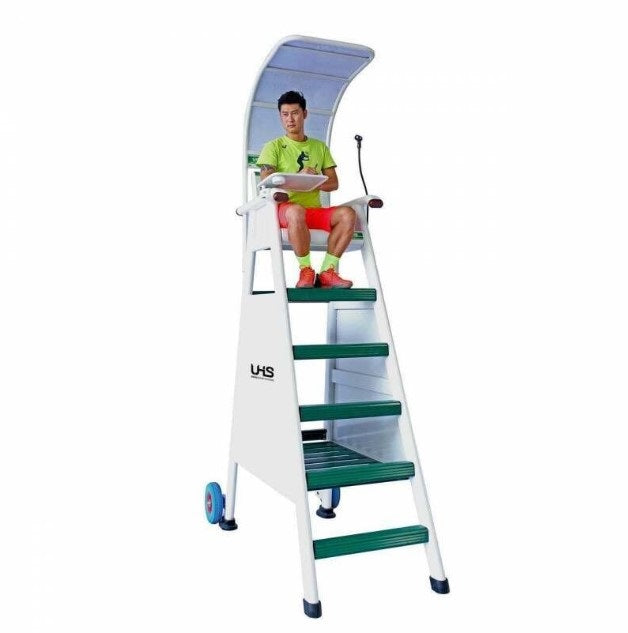 Cette chaise d'arbitre de tennis a été utilisée dans un certain nombre de tournois de haut niveau et répond à toutes les réglementations de l'ITF. Utilisée lors des Jeux d'Asie, de l'Open de Chine, de l'Open féminin WTA et du Centre national de tennis LTA, cette chaise d'arbitre haut de gamme convient à une utilisation au plus haut niveau du tennis professionnel. Taille du support : 6,5 pi L x 3,2 pi l x 10 pi H | 2 m de longueur x 1 m de largeur x 3 m de hauteur. Taille de la table : 1,6 pi L x 1 pi l | 0,5 m de longueur x 0,3 m de largeur. Largeur de l'auvent : 2,3 pieds | 0,7 m.