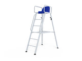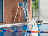 Chaise de sauveteur hauteur de 86.5" (2.20m) x 42" de largeur et 65.75" de profondeur. Structure en aluminium et banc de PVC. Pattes ajustable pour mettre à niveau et crochets pour serviette, veste ou gilet. Échelle anti dérapante pour monter en sécurité. Siège avec drainage et recouvrement de patte en caoutchouc pour protéger les planchers.