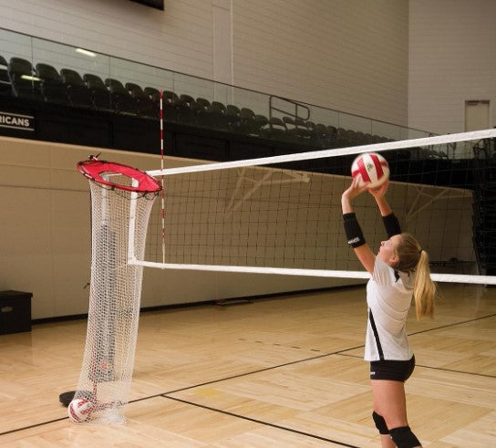 Cible d'entrainement de volleyball Tandem Challenger. Hauteur de poteau réglable. Le filet robuste recueille les ballons pour une récupération facile. Comprend un poids de 10 kg pour plus de stabilité et 2 roues pour un transport facile. Réglable jusqu'à 3,6 m, l'anneau cible mesure 76,2 cm. Idéal pour les passes, le réglage ou la prise de vue