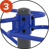 Barres parallèles classiques. 1,88m de long x 0,79m de large x 1,40m de haut. Fixation à ancrages au sol. Fait en acier galvanisé et peint bleu et gris anti corrosion. Deux hauteurs différents à l'utilisation 1,2m ou 1,3m. Couverture de PVC pour cacher les visses et écrous pour plus de sécurité.