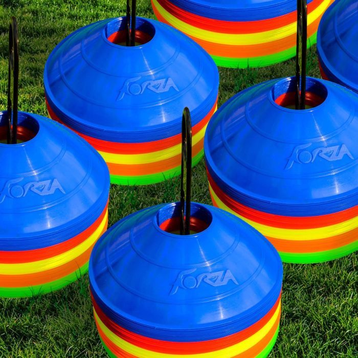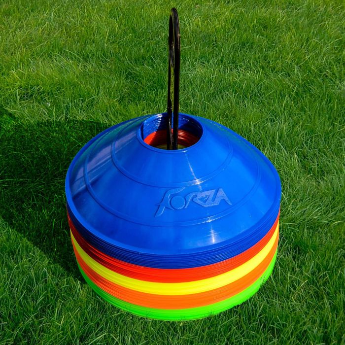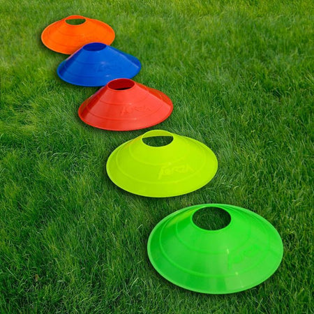 Cônes de marquage d'entraînement de soccer FORZA. Fabriqués en plastique résistant, les cônes ont une largeur de 20,5 cm et une hauteur de 5 cm. Ils sont livrés avec un support en plastique pour le rangement et la portabilité. Disponibles en 10 couleurs fluorescentes, ces cônes de marquage peuvent grandement améliorer l'efficacité et la concentration pendant les séances d'entraînement de soccer.