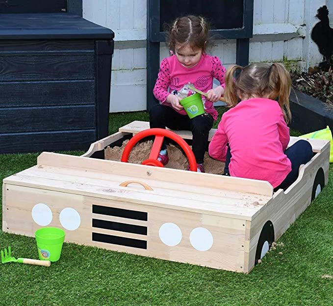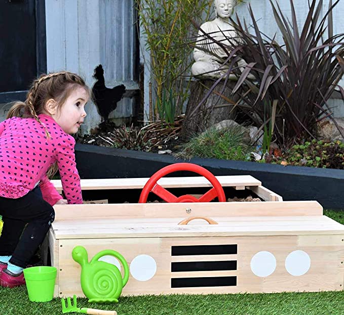 Carre de sable en bois en forme de voiture avec un couvercle qui procure des heures de plaisirs aux jeunes de n'importe quel âge. Construit pour être convenable a de très jeunes enfants. Facile a monter, stable et solide pour empêcher des bris. Résistant à l'eau, l'érosion et l'humidité du sable. La baie du moteur agit comme un coffre de stockage pour vos seaux, pelles et moules de sable. Viens avec une toile de protection solide pour empêcher les feuilles de s'introduire dans le bac de sable.