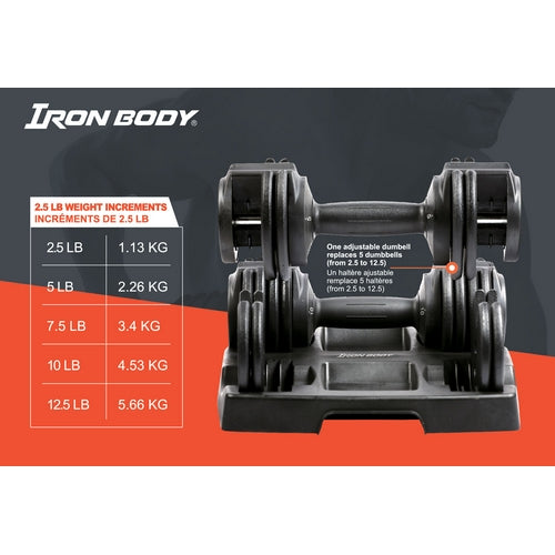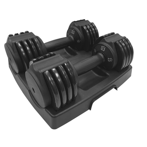 L'ensemble de 25lbs d'haltères ajustables est parfait pour votre entraînement à la maison ou dans un petit centre d'entraînement. Il ne prend pas beaucoup de place et s'ajuste facilement au poids désirés. Chaque haltère a un poids total de 12.5lbs et s'ajuste en un simple petit tour pour ajouter ou enlever 2.5lbs. Donc, vous pouvez faire 2x 2.5lbs, 2x 5lbs, 2x 7.5lbs, 2x 10lbs et 2x 12.5lbs. L'ensemble vient dans un coffre de rangement facile à glisser en dessous d'un sofa ou dans votre garde-robe!