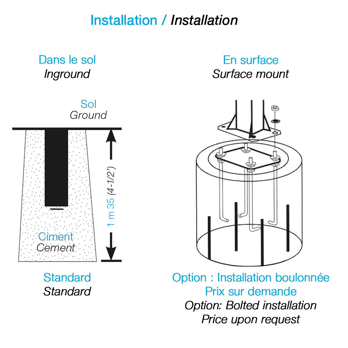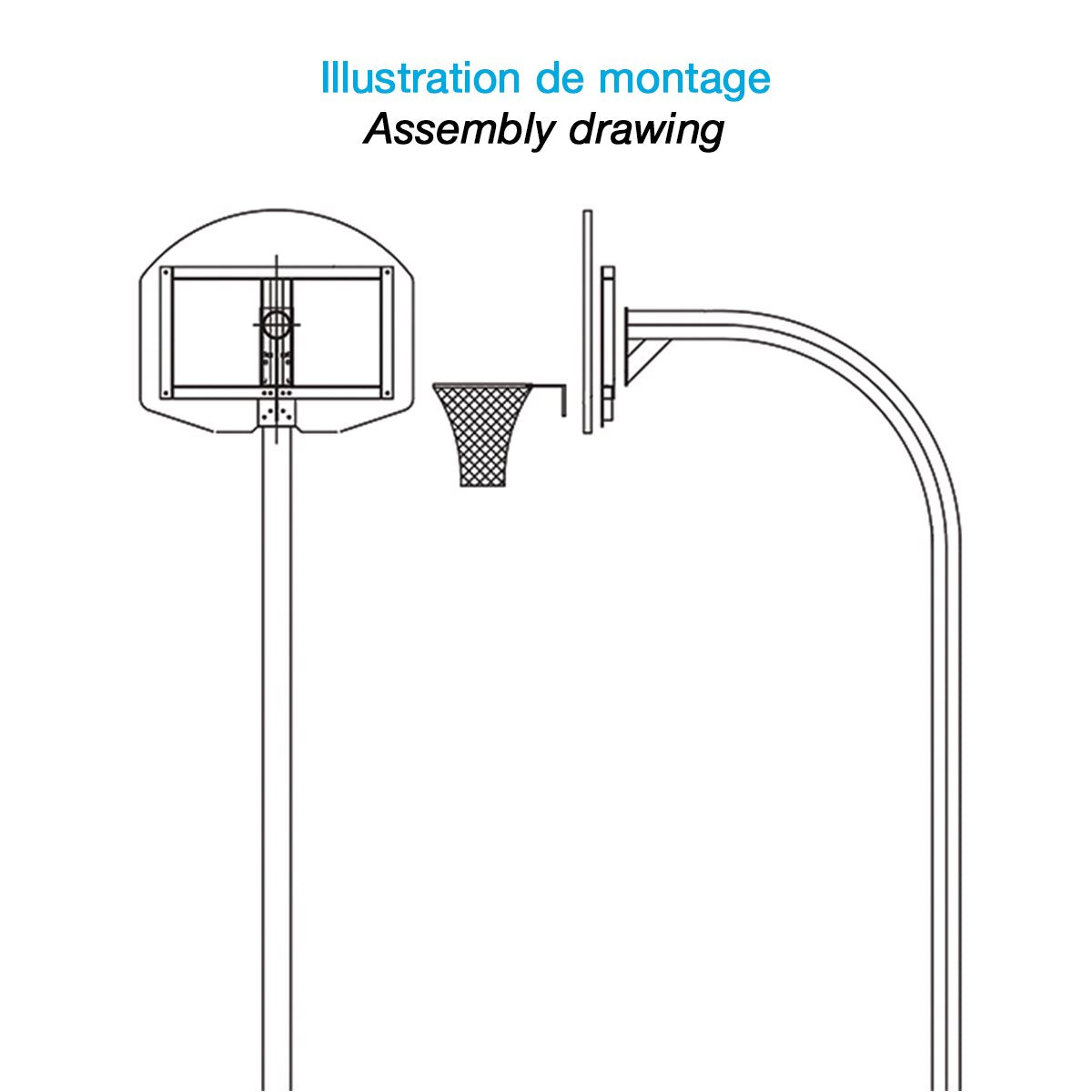 Ensemble de but de basketball extérieur. Un poteau style « Gooseneck » en acier galvanisé de 10 cm (4") de diamètre avec une extension de 1 m 20 (4'). Un panneau de polyéthylène de 1,9 cm (3/4") d'épaisseur (# LG-8P) de forme éventail. Un panier à anneau double très robuste à montage avant. un filet de basketball à chaîne.