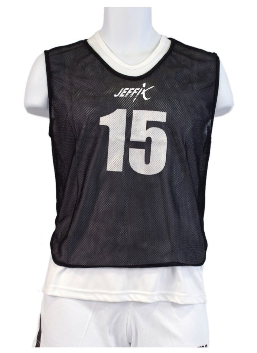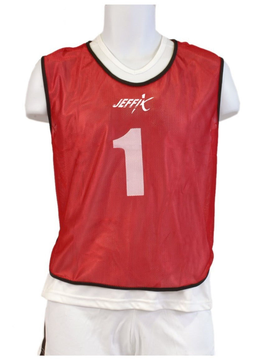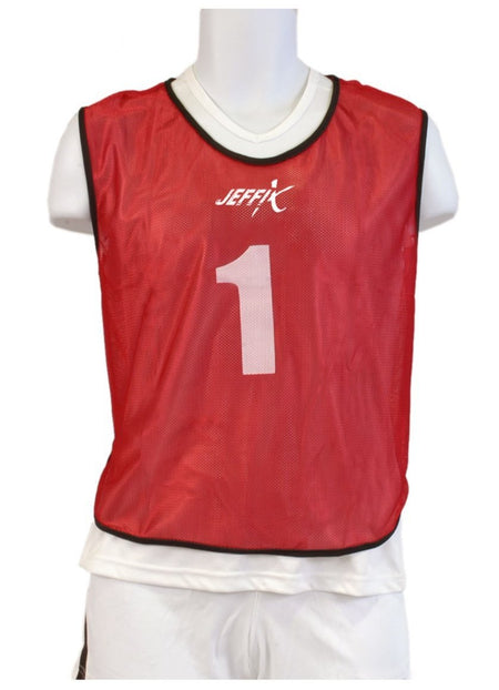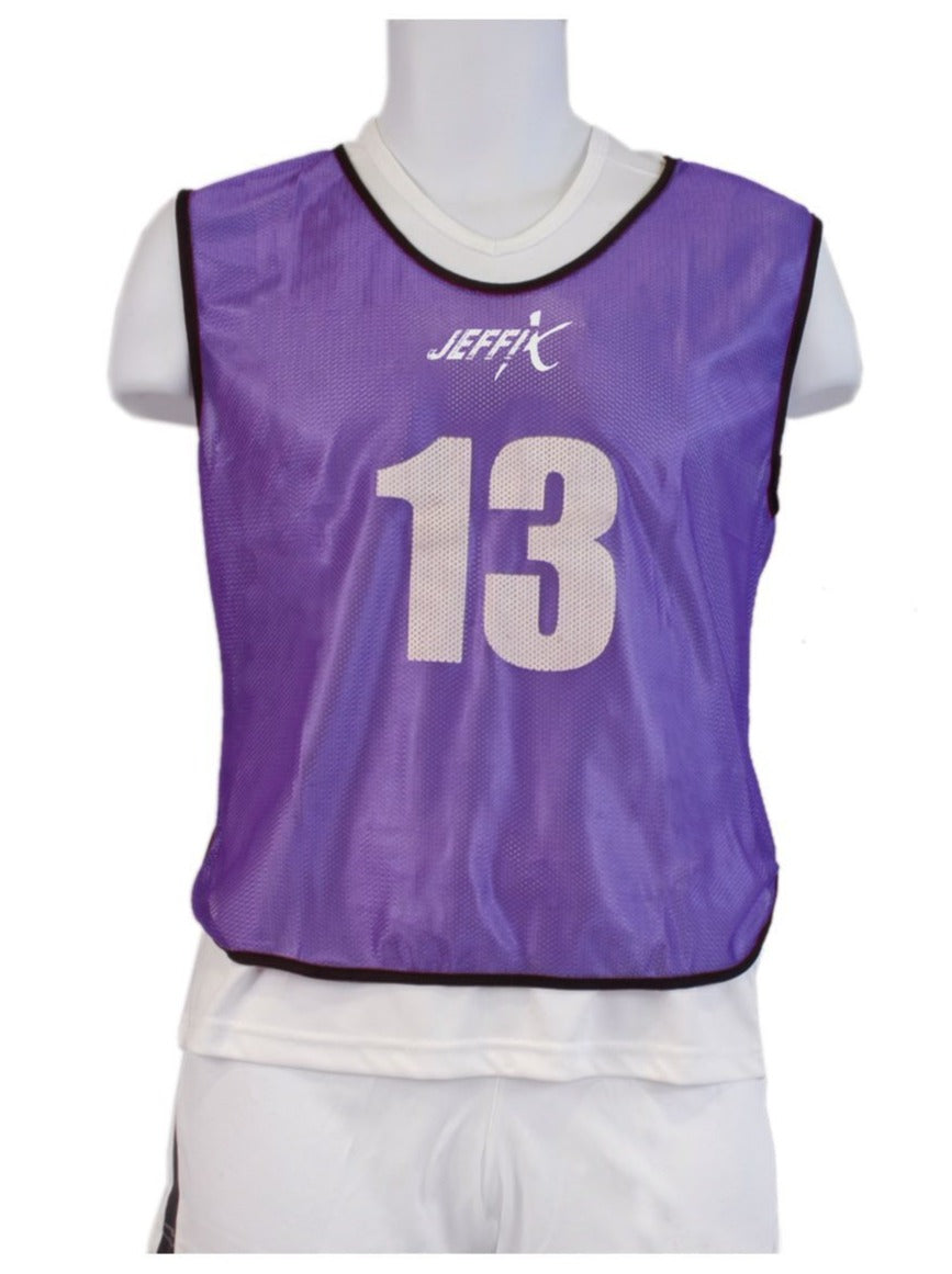 Choix de couleur et de trois grandeurs. Les dossards sont numérotés de 1 à 15. Les numéros sont d'un seul côté.