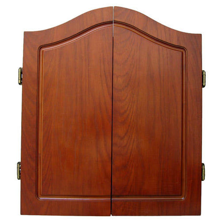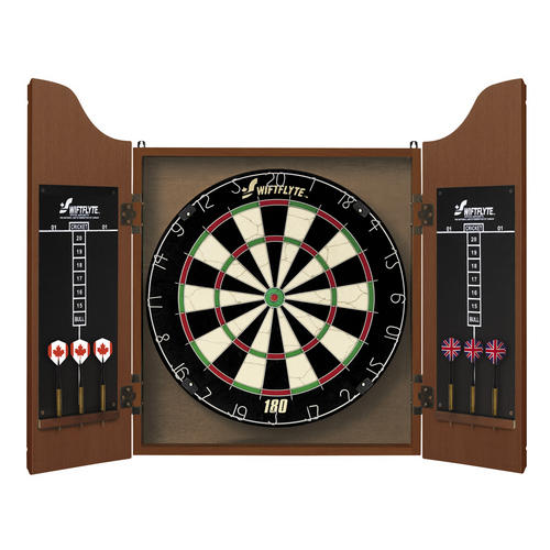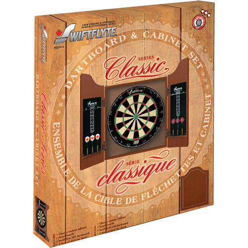 Ces ensemble de jeux de fléchettes avec cabinet couleur noyer de la série Classic "Swiftstyle" fournisseur officiel de la Fédération de nationale de dards du Canada comprennent le cabinet en pin couleur noyer, la cible swiftstyle 180, 2 set de dards pointe en acier recouvert de bronze ainsi que le tableau à craie avec le jeu de cricket.