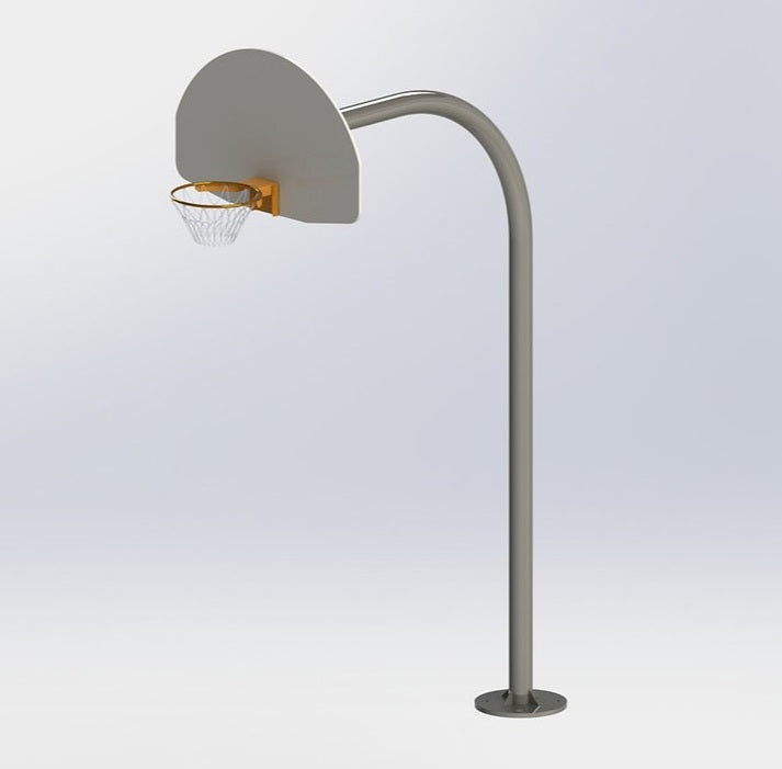 Ensemble de poteau de basketball avec panneau de polyéthylène. Cette structure pour l'extérieur sur tube de 5" dia. courbé et ajustable jusqu'à 11". Extension de 6' de longueur. Ancrages prise avant pour panneau de polyéthylène en éventail ou rectangulaire avec deux choix de grandeur 3/4" x 36" x 48" ou 1" x 48" x 72"