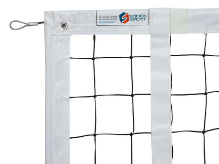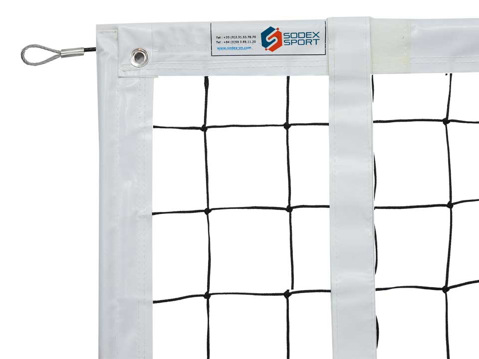 Filet de volleyball de compétition FIVB en polyéthylène haute densité traité UV tressé à 3mm de diamètre. Tension par câble en acier galvanisé de 5mm de diamètre. Couleur du filet noir. Bande contour blanche.