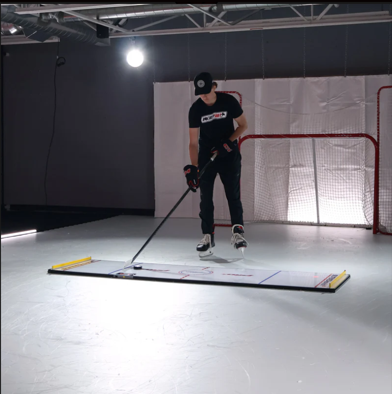 L'entraîneur de gestion du bâton SuperDekerPro dispose d'une surface de glace synthétique qui ressemble exactement à de la vraie glace. Entraînez-vous au hockey de haute intensité partout grâce à ce tableau d'entraînement sans fil pour la gestion du bâton.