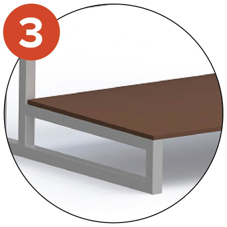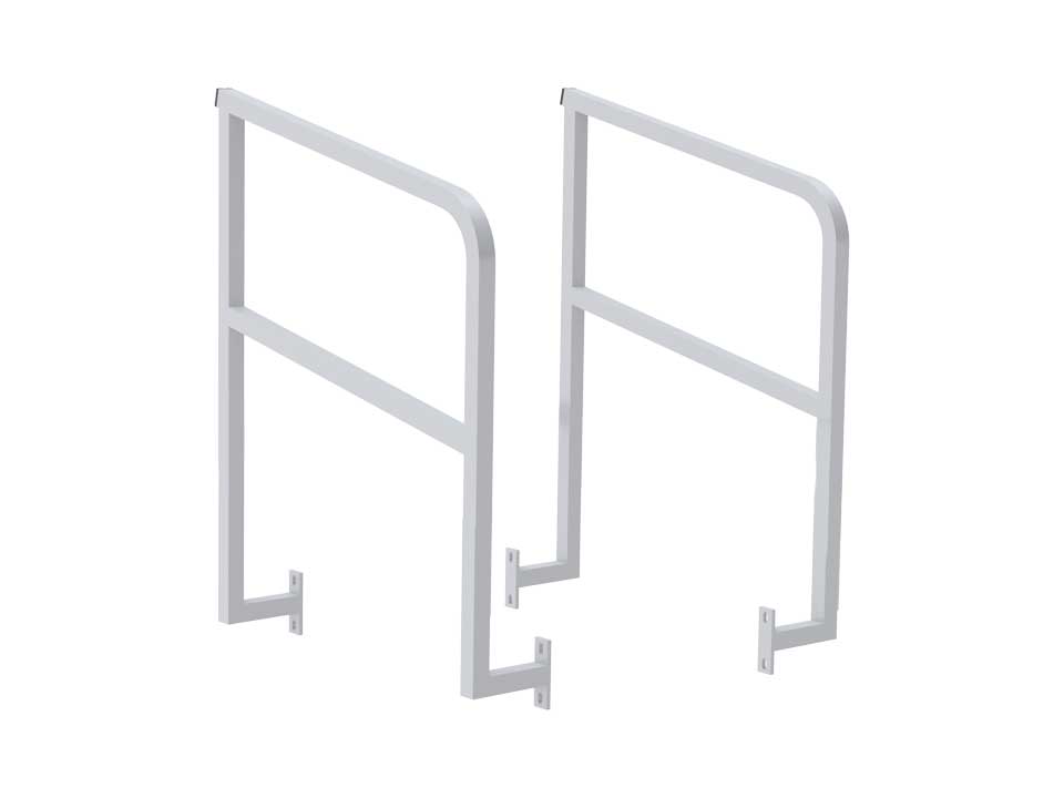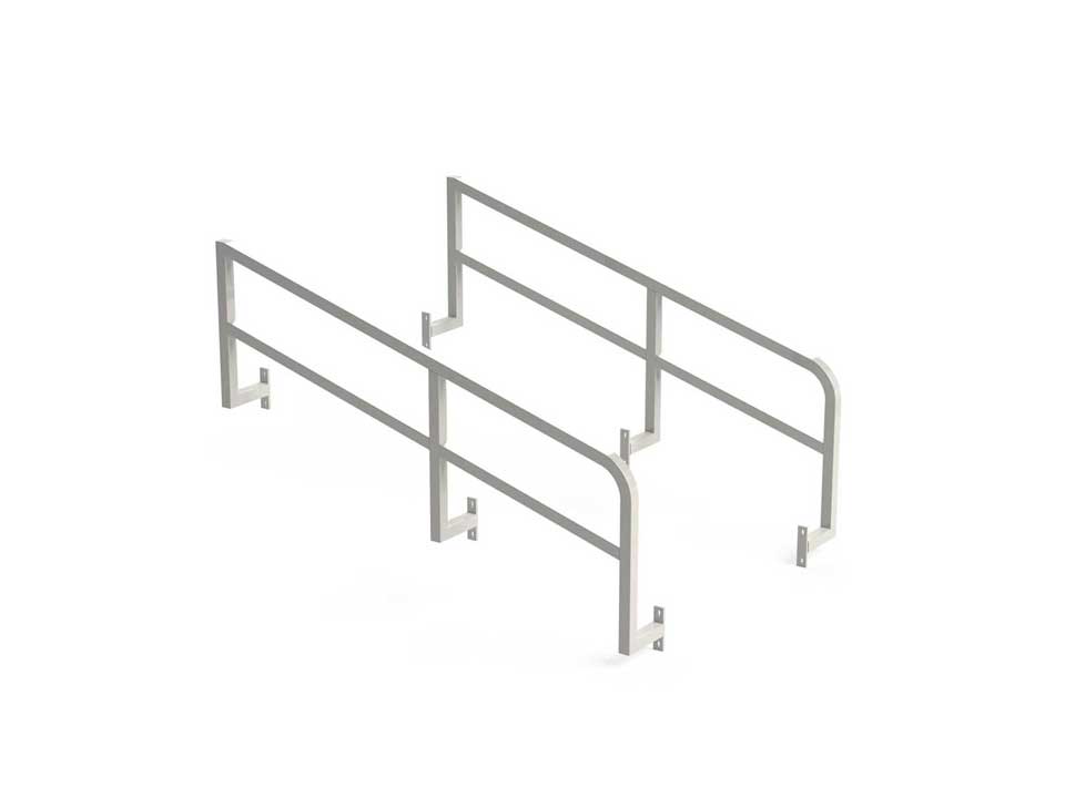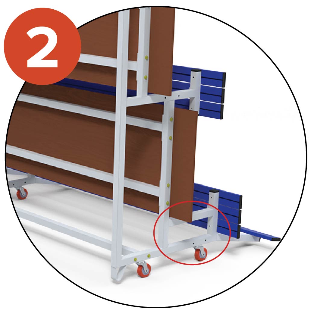 4 roues pivotantes avec freins par module facilitent le déplacement et le rangement. La dernière rangée est renforcée afin de supporter le poids de l'ensemble de la structure en position de stockage. Barres de renfort sous le plancher pour plus de rigidité. Offert avec option de rail de sécurité.