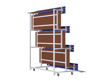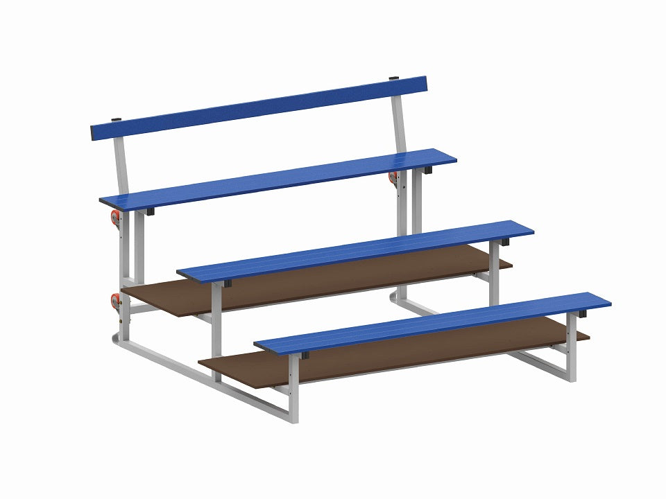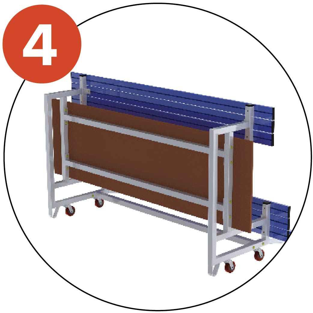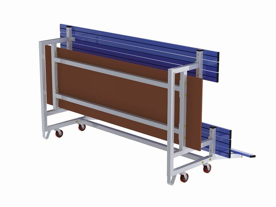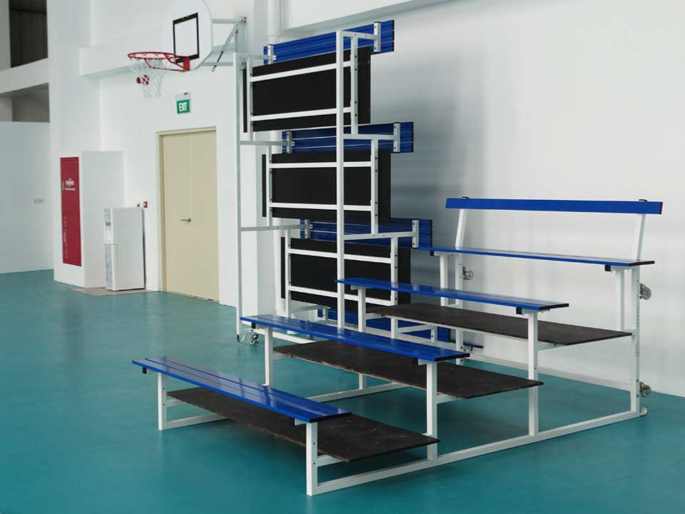 Planche en bois antidérapant. Conception simple et optimisée, adaptée aux salles de sport, aux courts et aux événements extérieurs. Les gradins peuvent être reliés entre eux pour offrir des sièges monoblocs plus grands. Lorsqu'ils ne sont pas utilisés, ces gradins peuvent être retournés sur le côté où les roues facilitent le mouvement.