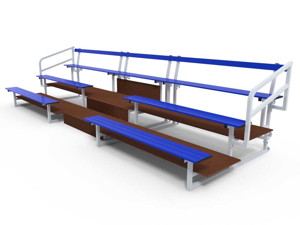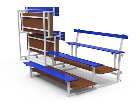 Gradin mobile à bascule avec choix de 2, 3 ou 4 rangées de haut. Fabriqué de tubes carrés 40mm en acier peint blanc et siège thermolaqué bleu. Conforme à la NF EN13200-1. Conforme à la NF EN13200-7. Siège et dossier en aluminium 80x20 mm thermolaqué bleu.