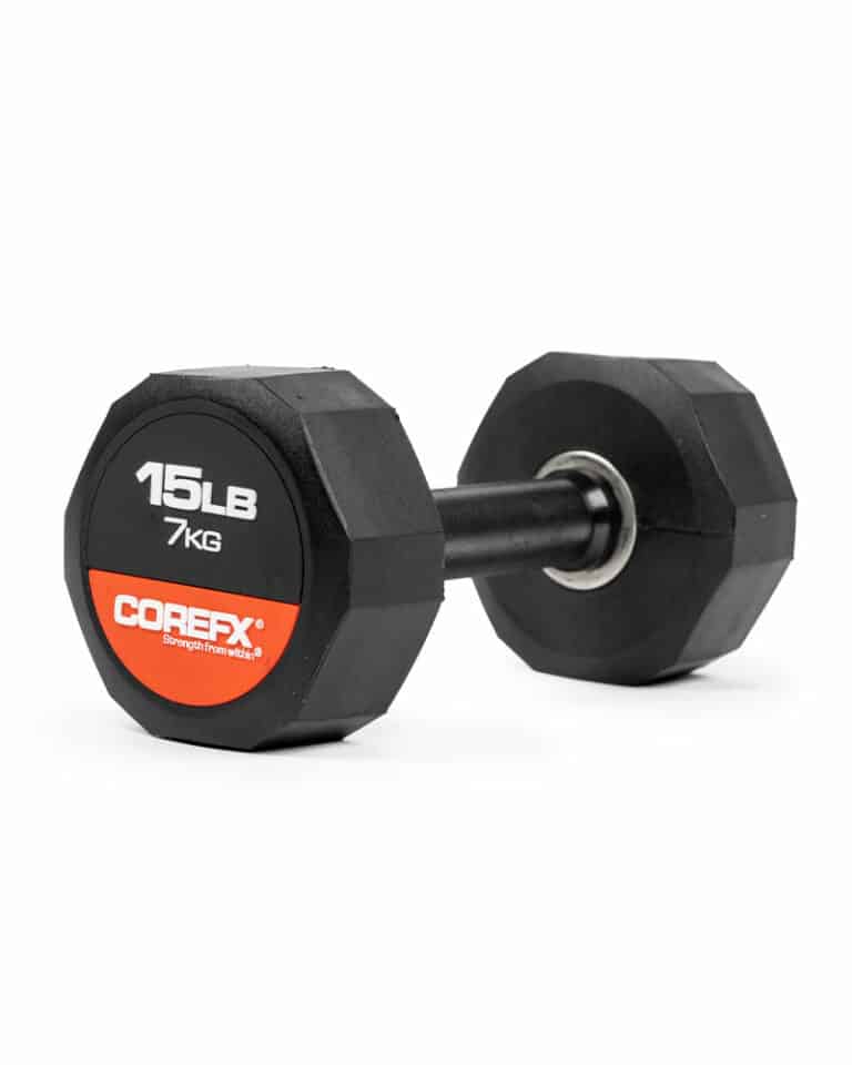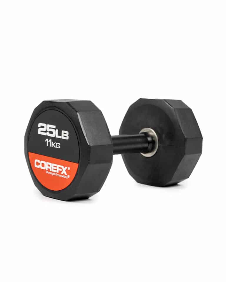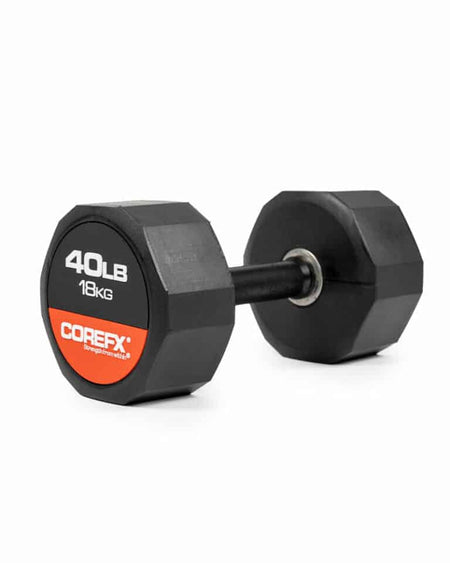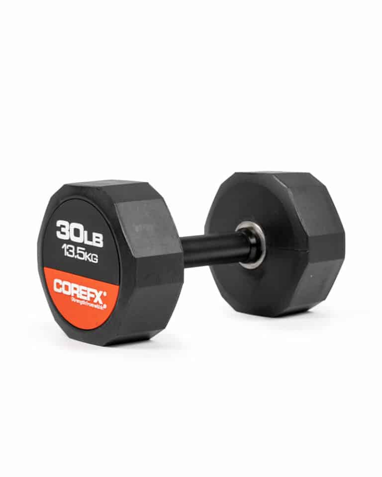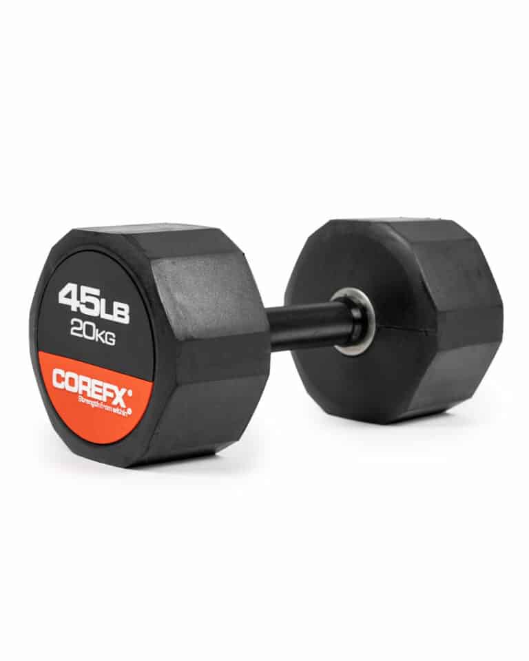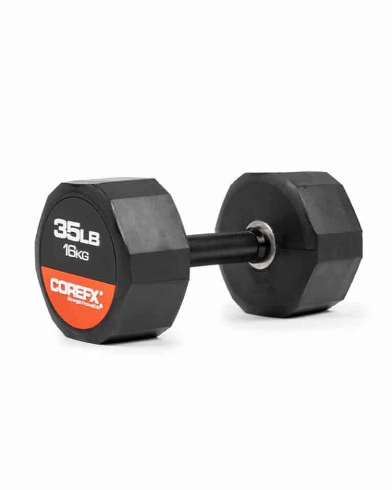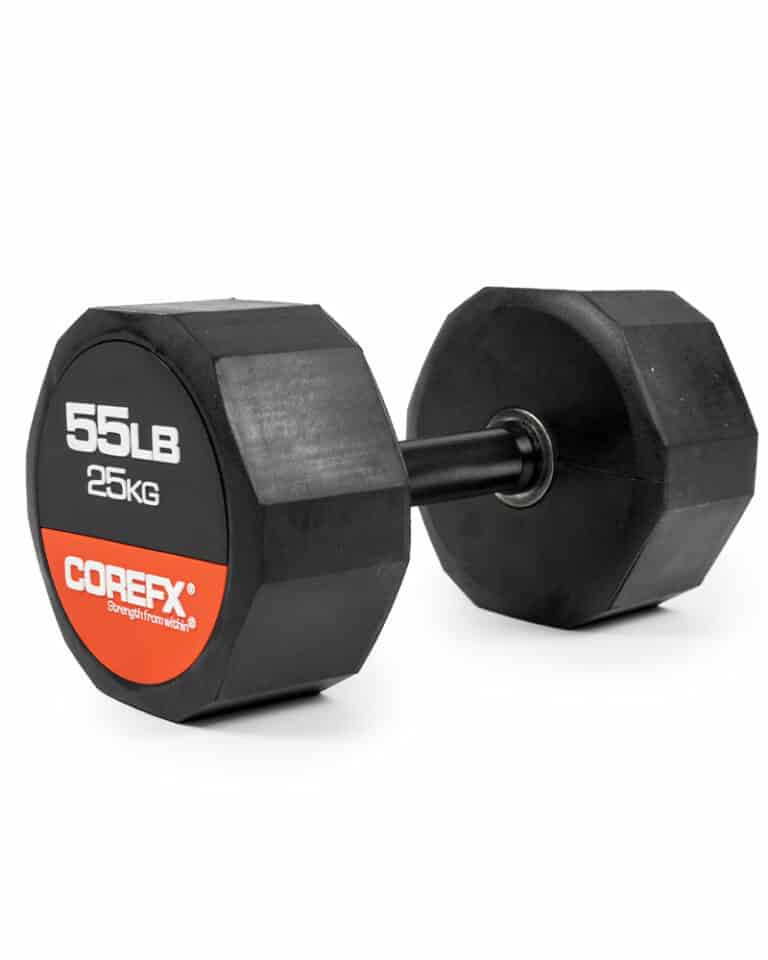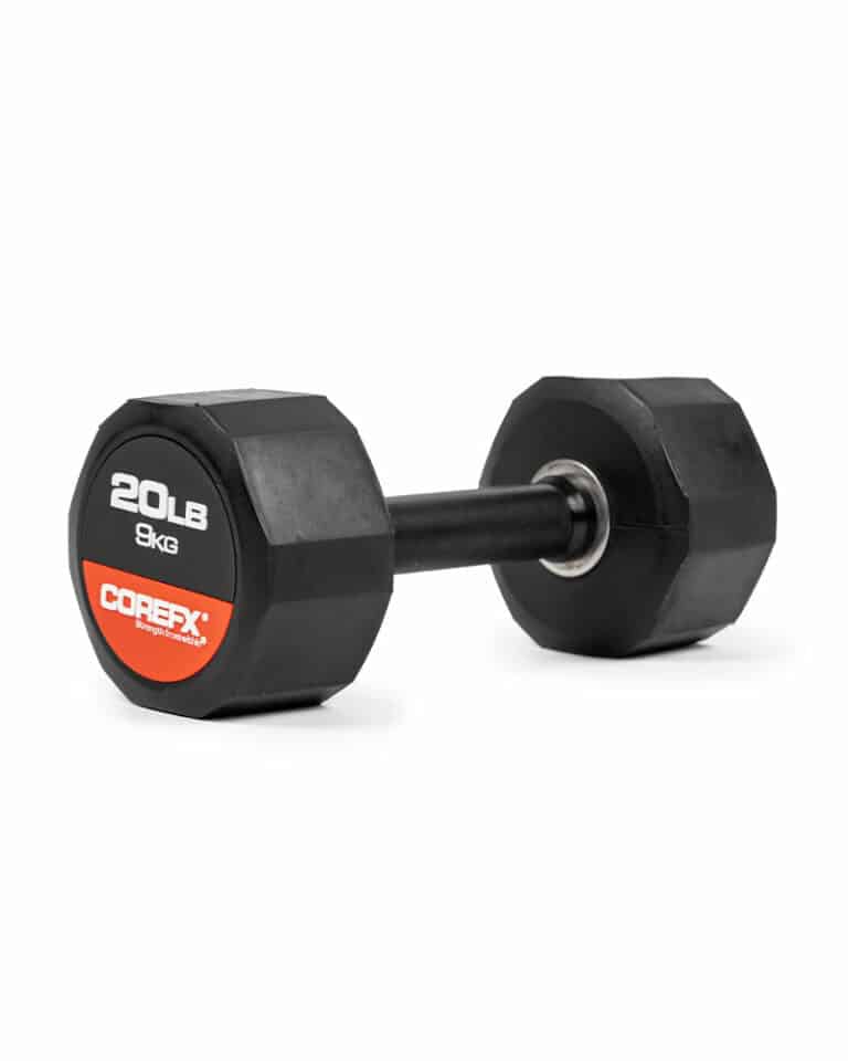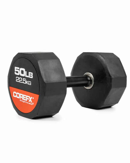 L'Haltère en Caoutchouc COREFX est conçu pour protéger vos sols des dommages et éviter que le poids ne roule grâce à son revêtement en caoutchouc à 12 côtés. Chaque haltère assure une prise sûre pendant vos exercices grâce à son striage de qualité moyenne. (Vendu en tant qu'haltères individuels)