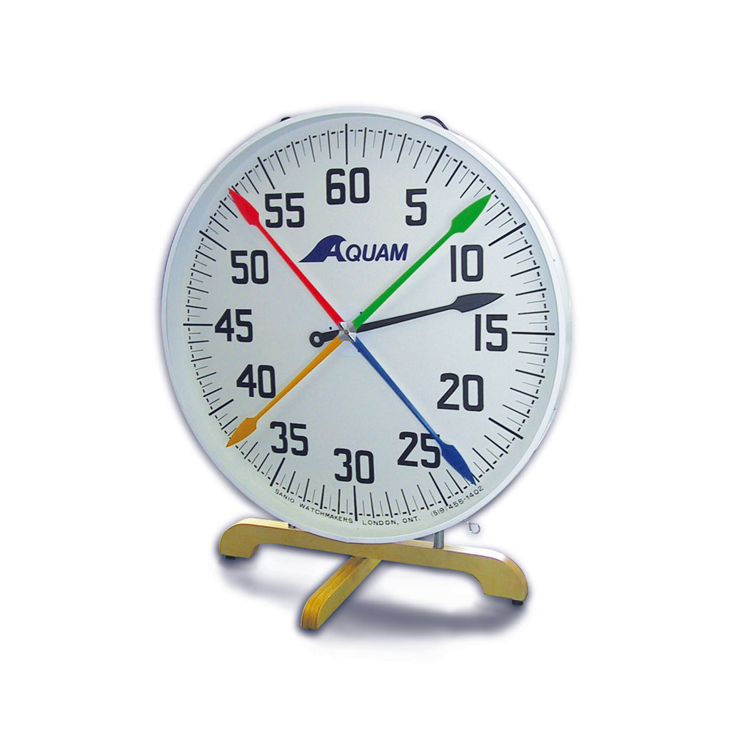 L'horloge de piscine sur pied Sanio 36 po de diamètre, les chiffres sont lisibles de n’importe où dans la piscine. L'horloge est doté d’une aiguille pour les minutes et de quatre aiguilles de couleurs variées pour les secondes. Une surface transparente en acrylique recouvre l'horloge.