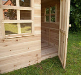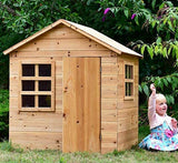 Maison en bois extérieur pour enfant qui procure des heures de plaisirs aux jeunes de n'importe quel âge. Construit pour être convenable a de très jeunes enfants. Facile a assembler grâce a un manuel clair et des pièces simples et identifiées. La maison est stable et solide pour empêcher les bris. Résistant à l'eau, l'érosion et l'humidité, la maison inclut une couche additionnelle au plancher afin d'empêcher l'accumulation d'eau. C'est recommandé de traiter le bois de la maison ou de la peindre, cela peut être un beau projet familial (Voir image).